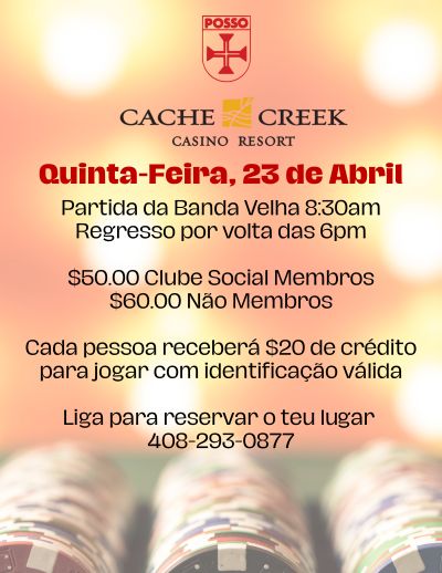 POSSO Day Trip to Cache Creek Casino Resort Thursday, April 23 Leaving PBSJ at 8:30 a.m. Return around 6 p.m. $50.00 Clube Social Members $60.00 Non-Members Each person will receive $20 gambling credit with valid ID Call to reserve your spot 408-293-0877