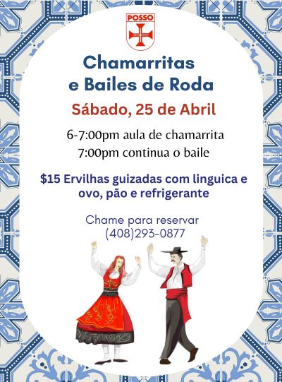 Chamarritas are back! Saturday, April 25 6-7:00 p.m. chamarrita class 7:00 p.m. dancing continues Food available: $15 pea stew with linguica and egg, bread and soda Call to reserve (408)293-0877